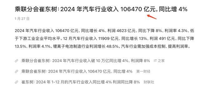 根据乘联会的数据,2024年汽车行业总收入虽高达106470亿元,但利润却仅有4623亿元,利润率仅为4.3%。这一数字远低于许多加工制造类下游企业的利润率,令人不禁质疑,被誉为“工业明珠”的汽车行业,为何会陷入如此困境?